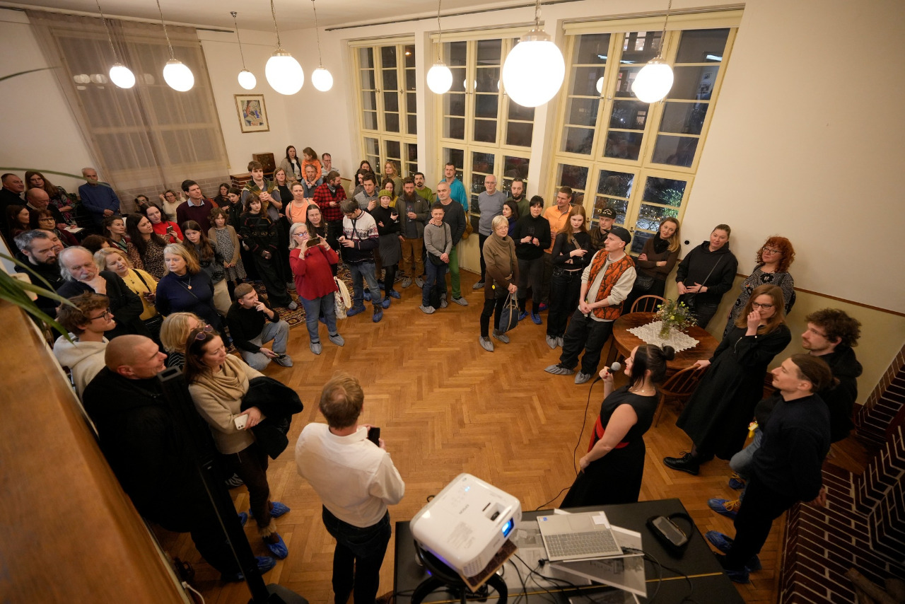 Než Adam Štěch se z obrazovky vyjádřil k vystaveným fotografiím, tak nás paní Kristina – ale spíše už jen ty z nás, kteří byli ve Vile poprvé – obeznámila v krátkosti s Vilou a její nejen stavební, ale i rodinnou genezí za posledních bezmála sta let. Její slova podaná svěže a vtipně zazněla v dočasně oněmělé hale slavné Vily Winternitz od Adolfa Loose a jeho spolupracovníka Karla Lhoty z roku 1932 postavené pro rodinu význačného pražského právníka, JUDr. Josefa Winternitze a jeho manželku Jenny, dceru Suzanu a syna Petra.