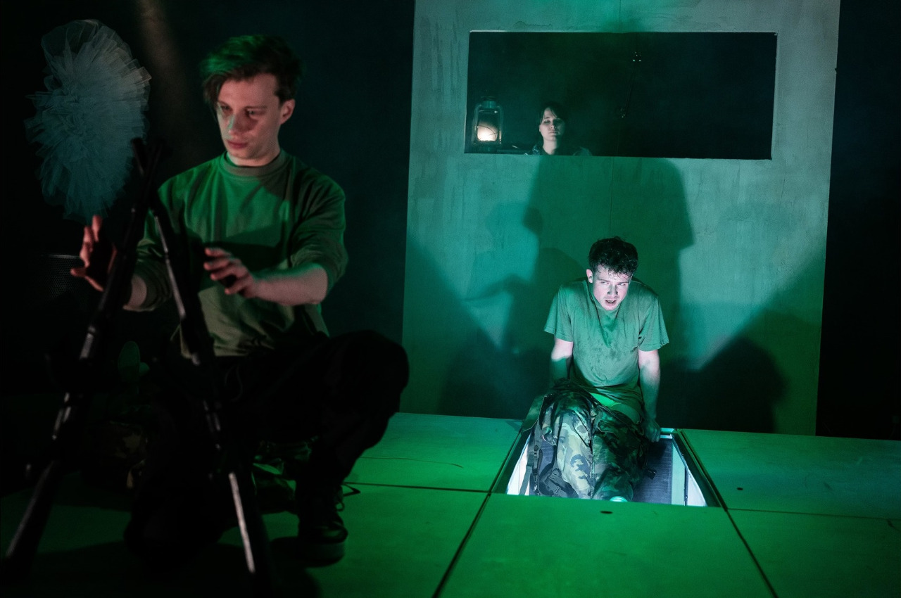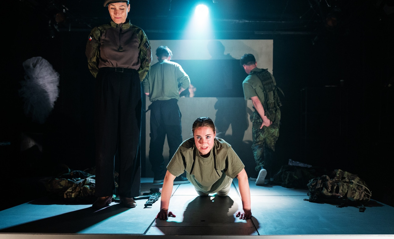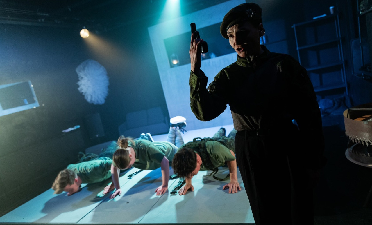 scénický klíč, kterým je paralela vojenských a hereckých cvičení.
