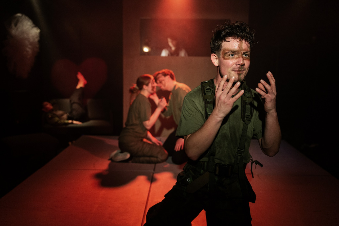 Hra o okamžicích rozhodnutí, které zásadně mění život, o ideálech, snech a realitě ve ´skutečných´ kulisách války. Je pocit morální odpovědnosti povinností? Pro koho je obrana vlas] otázkou přesvědčení? Pro koho je válka byznys? A co na to ´obyčejný český člověk´? Námět je inspirován současnou reálnou situací (a reálnými příběhy), kdy prudce stoupá zájem o dobrovolná vojenská cvičení v rámci posílení aktivních záloh Armády České republiky. Kromě současného rámce nabízí ponory do dob minulých, střídá prvky reálné a fantaskní. Inscenace rozvíjí téma svědomí a tíhy odpovědnosti v groteskním obraze válečné vřavy.“