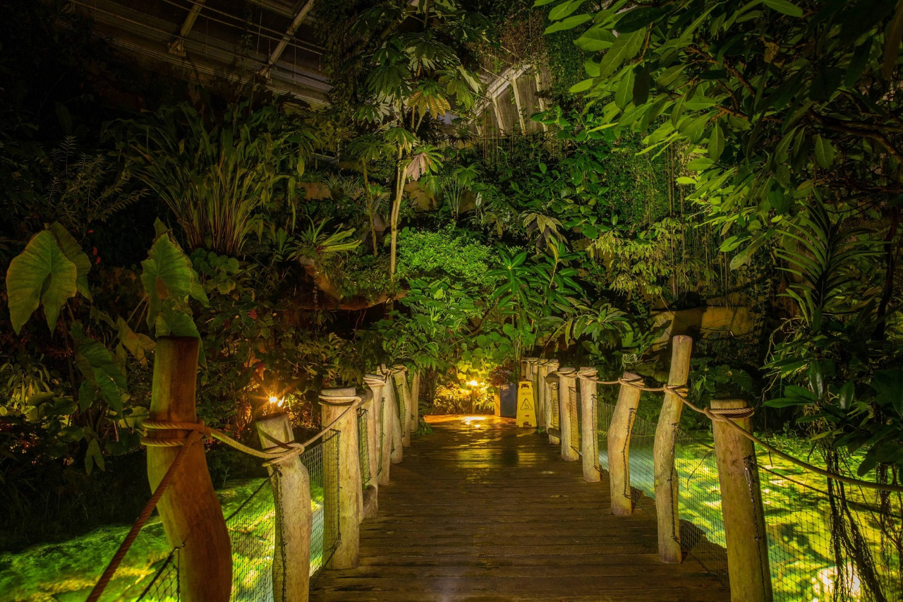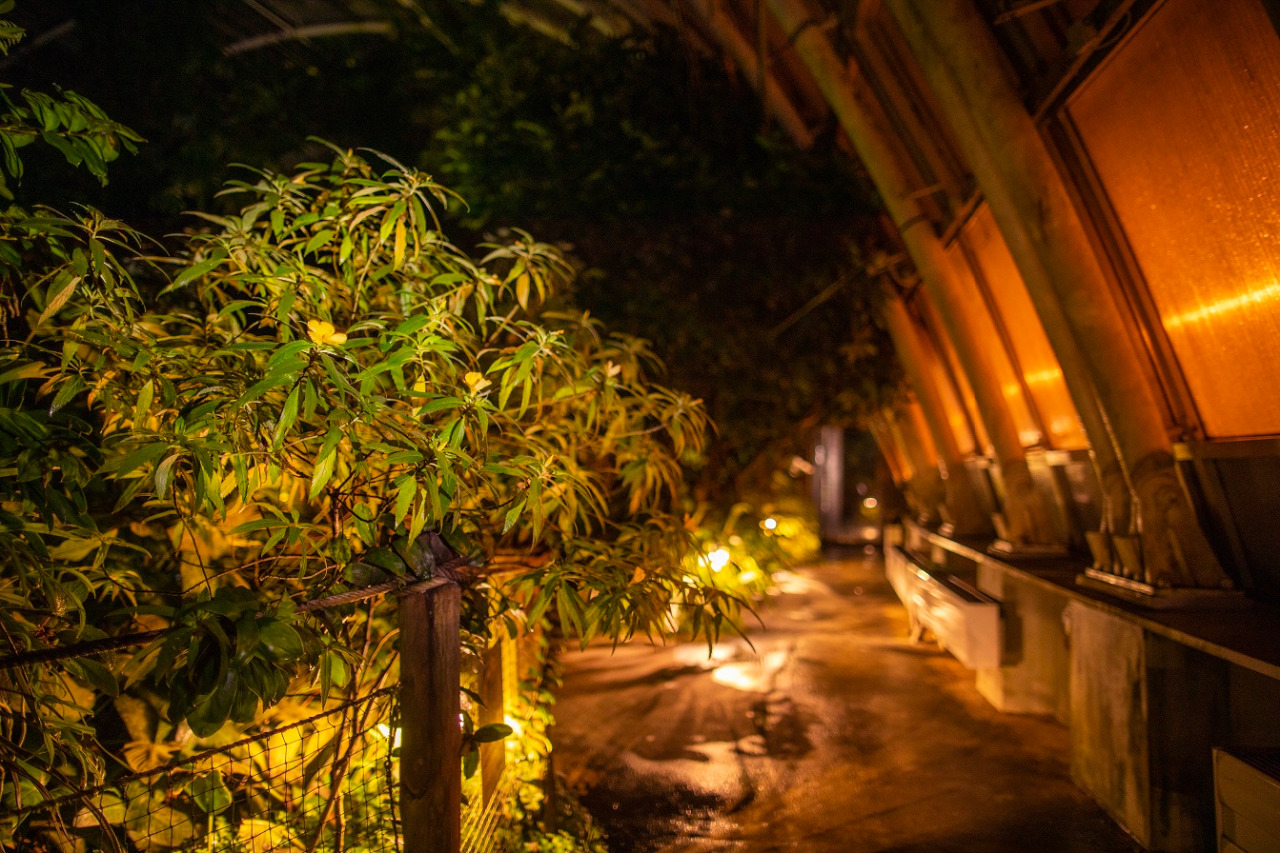 Některé druhy rostlin rozkvétají právě za tmy a omamně voní, skleníkem se nese koncertování tropických žabek.