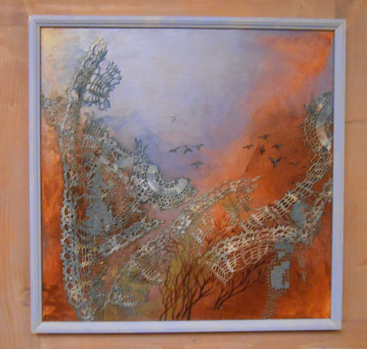 Pro svoji autorskou pražskou výstavu připravila Emília Hodasová opravdu bohatou kolekci svých obrazů. Při jejich prohlížení si publikum nemůže nevšimnout dvou dominantních charakteristik autorčiny tvorby. V první řadě to jsou abstrakce kombinované paličkovanou krajkou, která v obraze není jen nějakým doplňkem či snahou o ozvláštnění obrazu. Krajka v obraze není vůbec samoúčelná, ale právě ona obraz buďto dotváří, nebo přímo přetváří do vyššího lewelu.