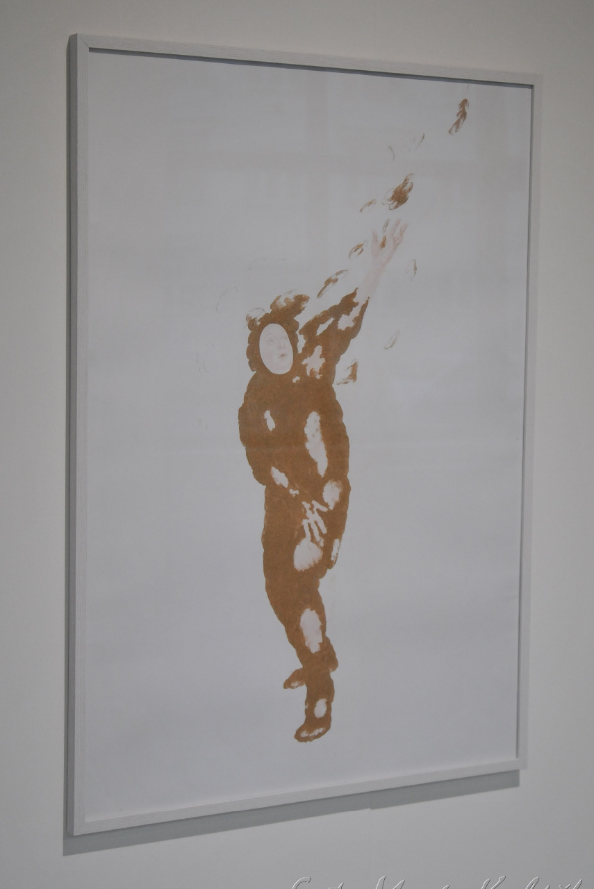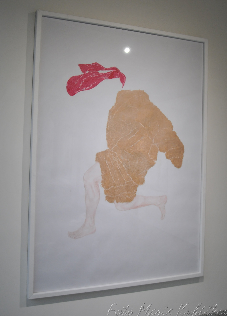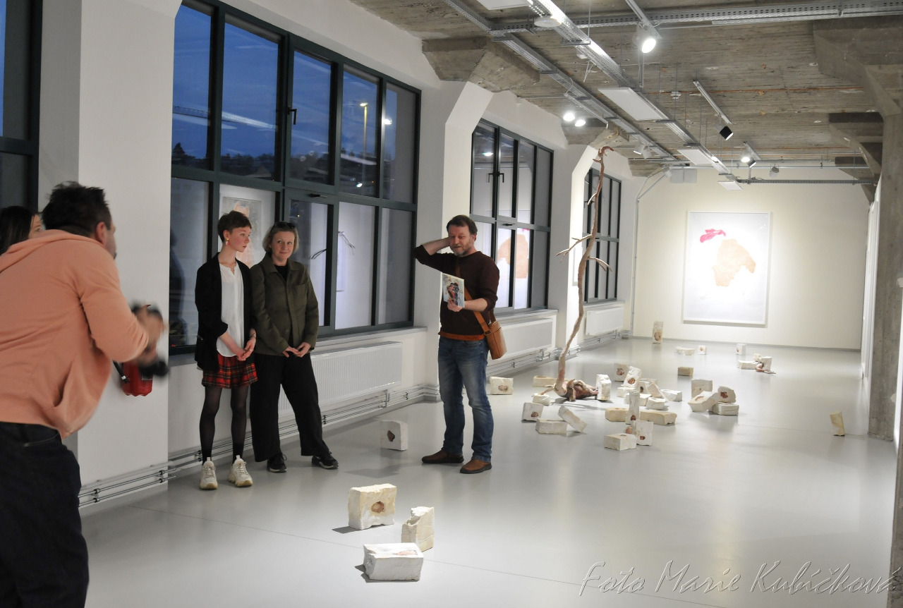 Po stěnách jsou obrazy Kateřiny Adamové Linhartové a výstavní plochu zaplňují práce sochařky, která si říká Mai.