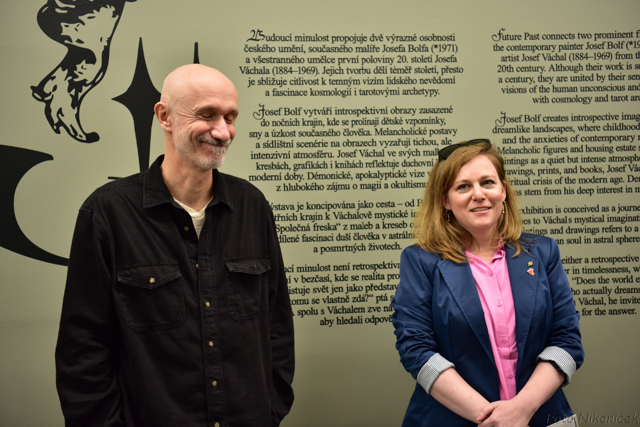 Zajímavá myšlenka, zajímavé téma, zajímaví autoři, rovná se zajímavá výstava. Tedy – nebýt ovšem autora scény, arch. Zbyňka Baladrána. Rafinovaně totiž zhmotnil trojrozměrně základní ideu kurátorky Sandry Baborovské. Její nápad na společnou výstavu dvou jmen Bolf a Váchal. Do výstavy se dá zdárně hluboce ponořit, vstoupit do ní, vžít se a nechat se pohltit. Dobrovolně se tak vydat do zajetí oné „Budoucí minulosti“, jak se výstava příhodně jmenuje, a jak je také přes most století i vůdčí myšlena celé výstavy.