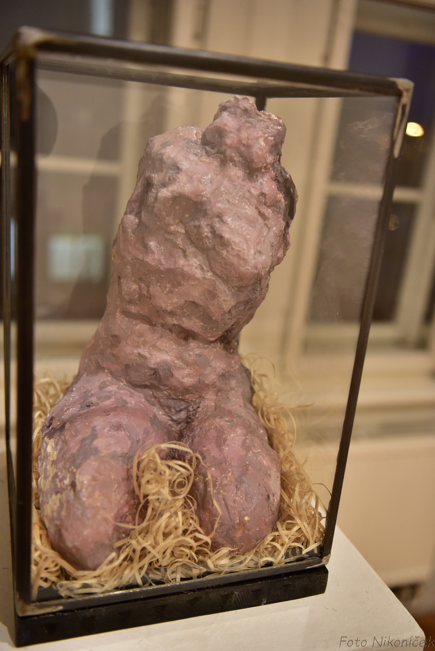 (Pupito, 2020, kolorovaná sádra, dřevěný podstavec potažený sametem, 45x53x56 cm)