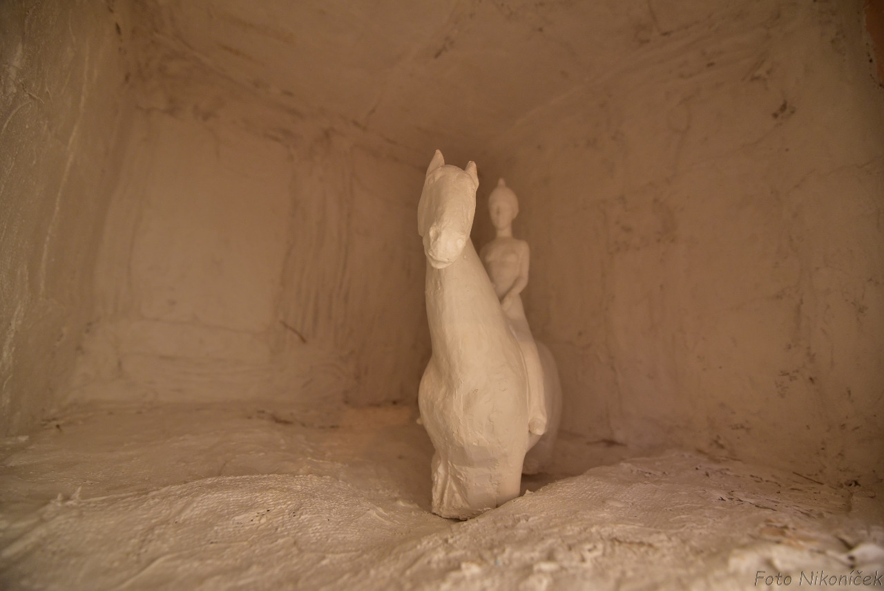 (Kůň a jezdkyně II, 2019, sádra, 59x40x14 cm)