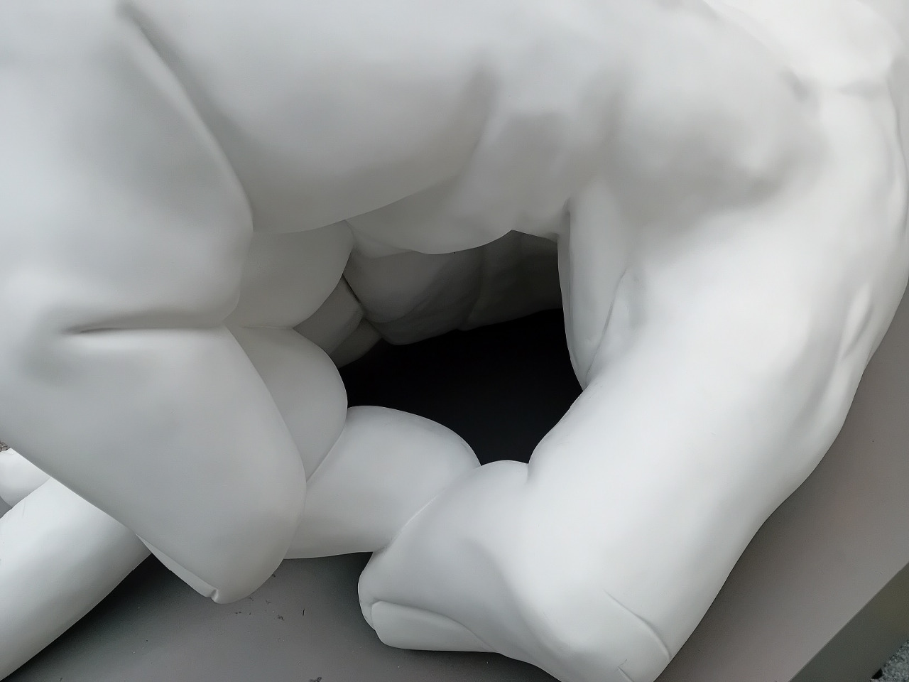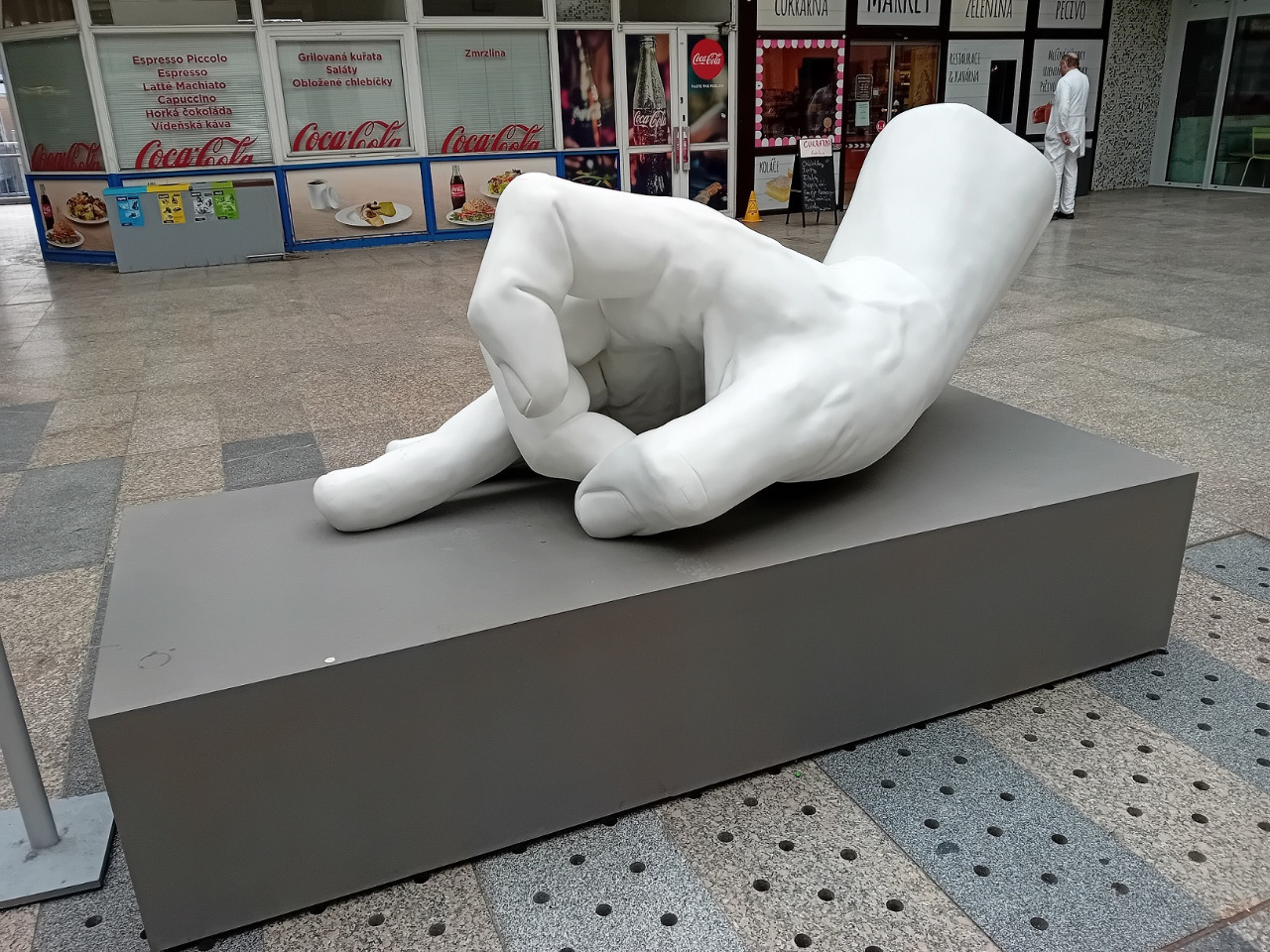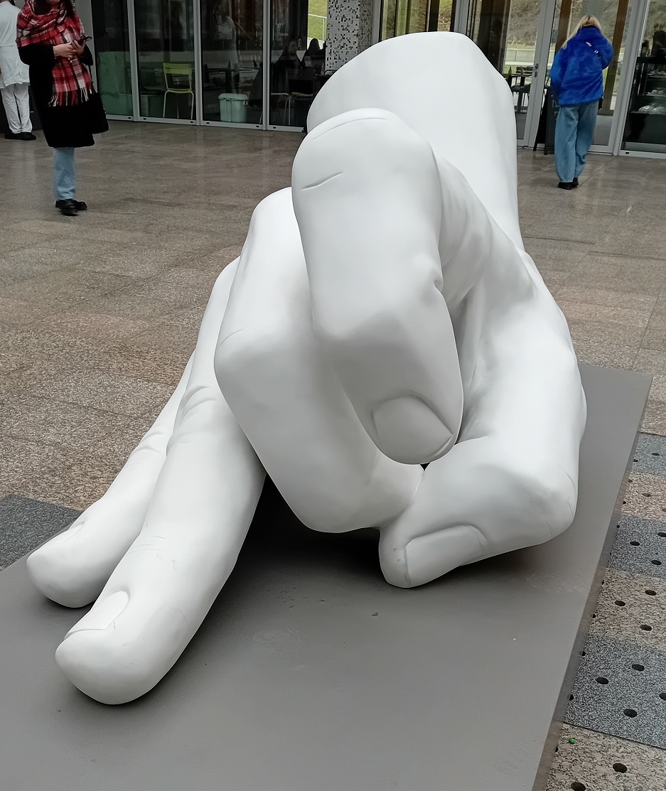 Ano, správně. Obří ruka a právě na prahu nemocnice.