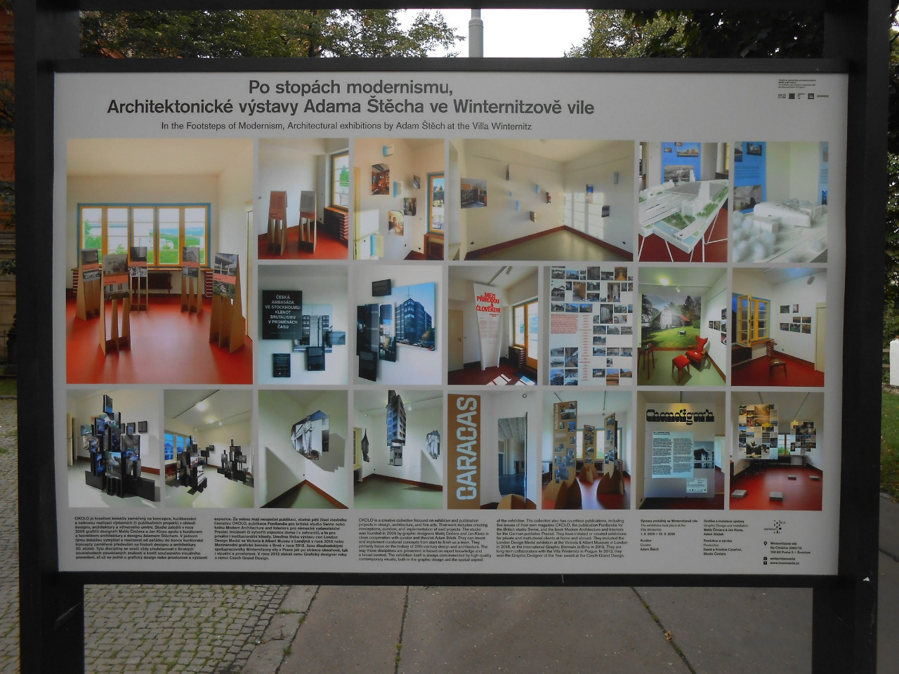 Během posledních pěti let zorganizovala Winternitzova vila ve spolupráci s kreativní skupinou OKOLO již 13 architektonických výstav. Ve všech, jejich kurátor, historik architektury a publicista, Adam Štěch, představuje méně známé kapitoly a polohy modernistické i současné architektury. Jeho kolegové, grafičtí designéři Matěj Činčera a Jan Kloss, zase tyto koncepty realizují ve vizuální a prostorové podobě.