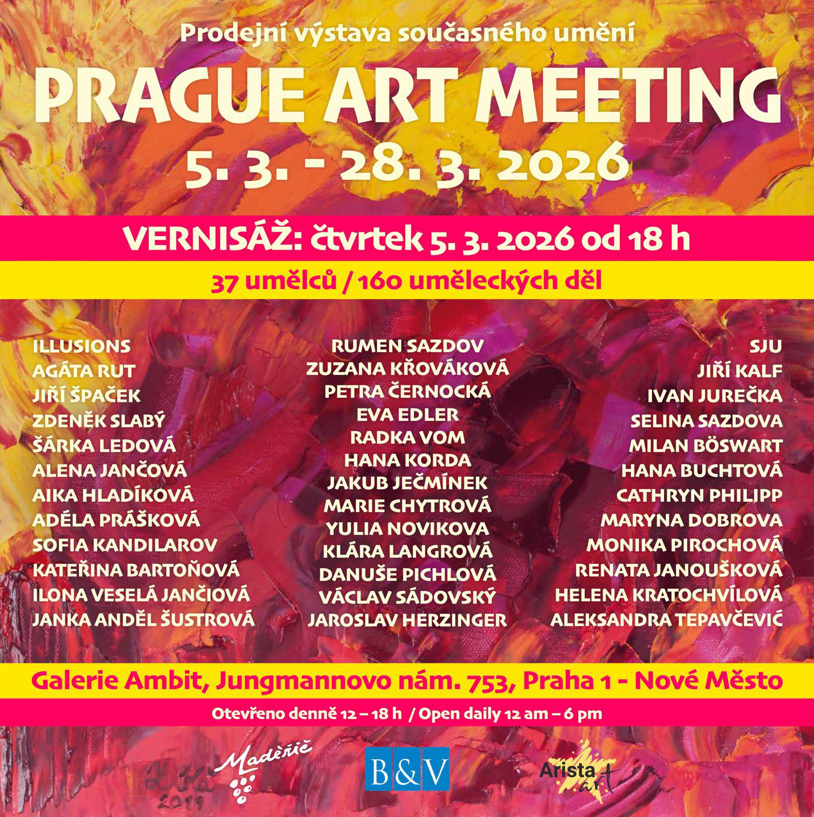 Mezinárodní projekt Arista Art již desátým rokem pořádá výstavy současného umění v srdci Prahy i v zahraničí. Výstava současného umění nazvaná Prague Art Meeting se letos koná již po třetí. Při pohledu na soupis převážně úspěšných umělkyň a umělců je jasné, že se divák setká s nepřeberným množstvím vskutku originálních děl z portfolia současného českého, ale i zahraničního, umění! Prague Art Meeting 2026, ale není jen klasická výstava, pomineme-li velice příjemný fakt, že po dobu konání výstavy, tedy po celý březen, se v Galerii Ambit můžeme setkat přímo s autorkami a autory vystavených děl, kteří se zde pohybují a rádi se osobně věnují zvídavým návštěvníkům. Lze si tu - po dohodě - vystavená díla také zakoupit (případně si usmlouvat cenu přímo s autorkou či autorem) a po celou dobu konání výstavy lze také absolvovat i různé doprovodné akce a stát se tak součástí vřelého sousedského setkávání komunit autorské s diváckou. Obě spojuje jedno jediné – obdiv k výtvarnému uměni. Výstavy rádi navštěvují také sběratelé umění, kteří zde najdou opravdu pestrou a širokou nabídku.