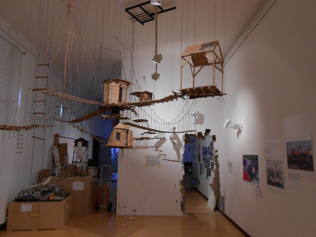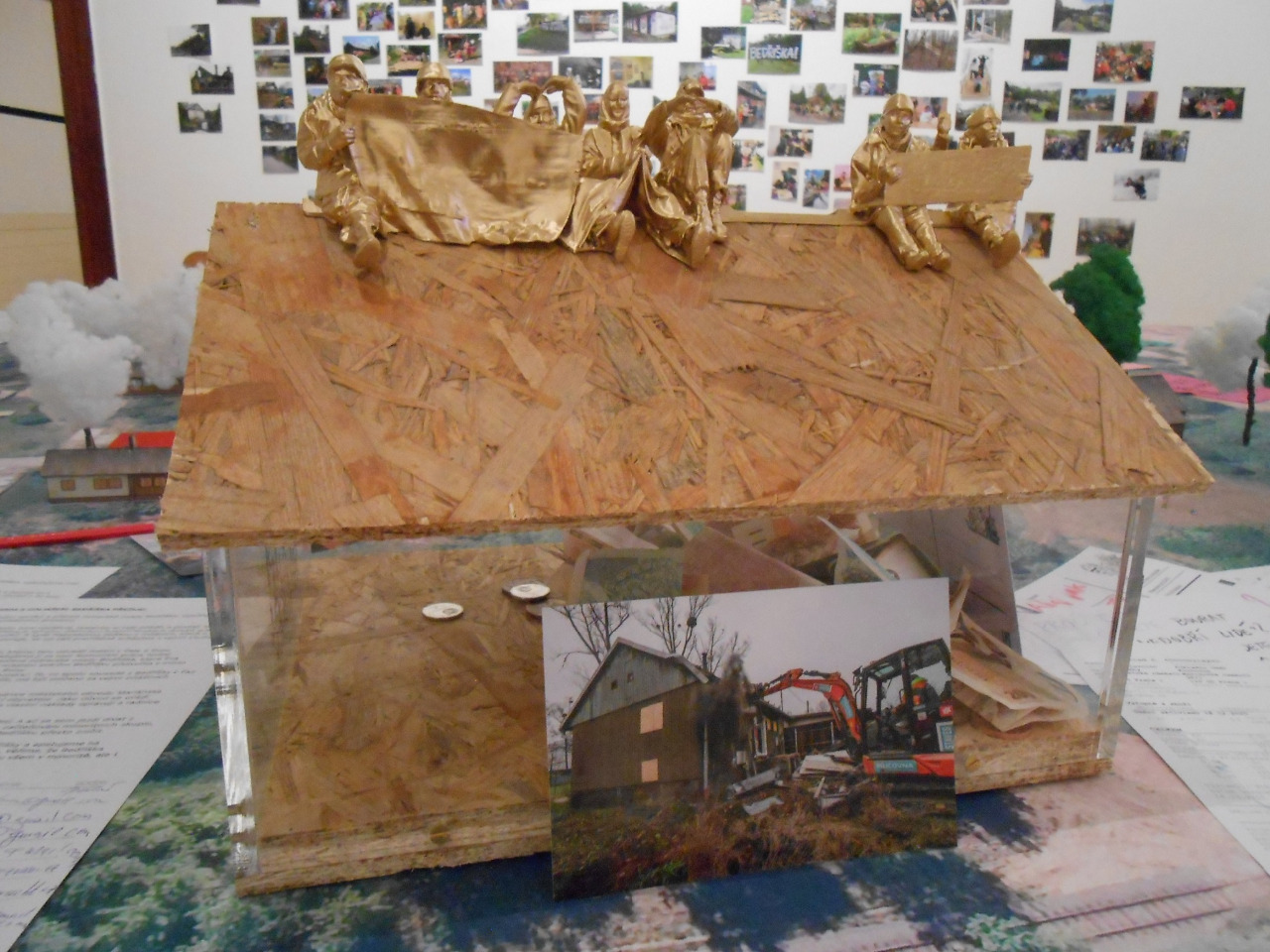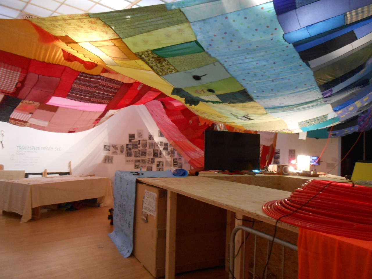 · Instalace výstavy používá reálné prvky protestní architektury, využívá recyklované materiály a vizuální jazyk aktivistických hnutí.