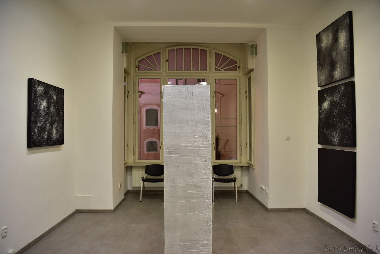 Výstava tak otevírá smyslům skryté prostory, zbavené tíže. Východiskem Vlachynské se stala myšlenka roztříštěného středu, pojatého jako nepřítomný, neznázornitelný a nedosažitelný bod, který je zde a všude. Prokeš setrvává u vzájemně se dotýkající plnosti a prázdna, jejichž protiklady v sobě uzavírají zrcadlící se čas.“