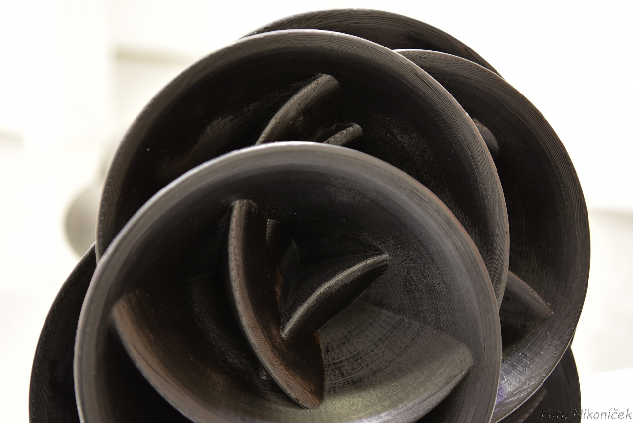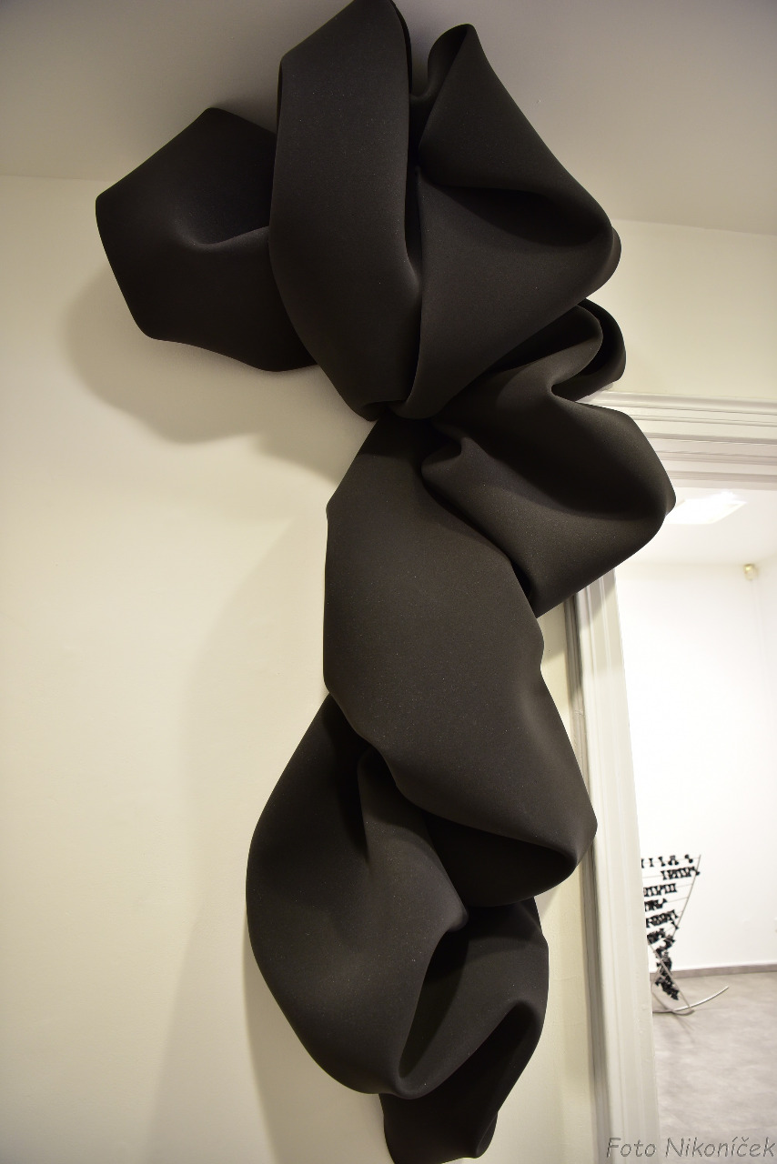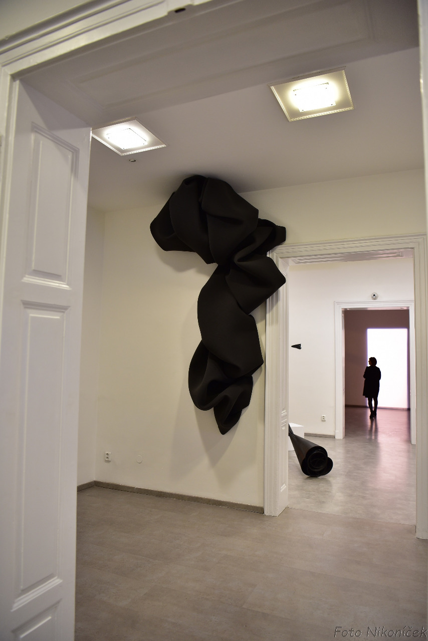 „Ve střední místnosti Topičova salonu se protikladné umělecké přístupy Vlachynské a Prokeše setkávají. Z opačných úhlů se věnují stavu nabývání a ubývání pevného a uzavřeného tvaru, sbližujícího jejich rozdílná pojetí. Ať už jde o dlouhý pás molitanu se zahnutými hranami, volně se rozprostírající po zdi, nebo o projekci vznikajícího černého kruhu, který po svém dokončení zvolna zase mizí. Stavy zdání a skutečnosti se tu vzájemně prolínají, ale i nezvratně rozevírají.