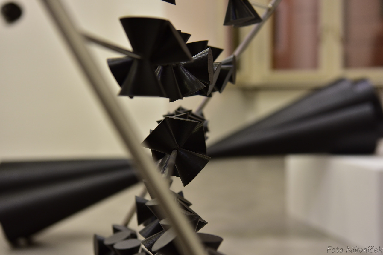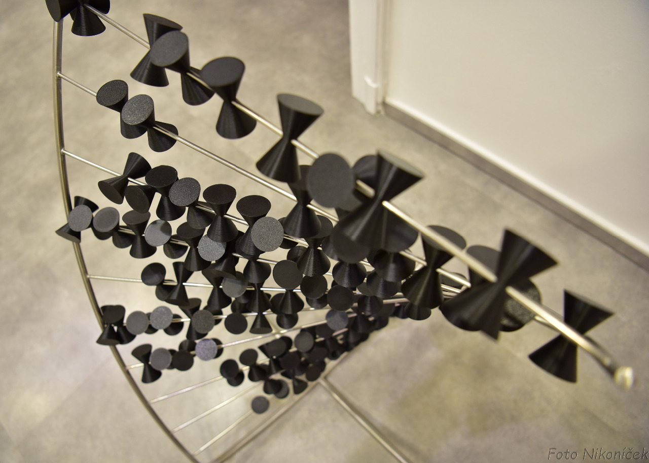 A je to tak. Členitost výstavního prostoru umožnila, že tři střední místnosti jsou věnovány objektům a reliéfům Petry Vlachynské, zatímco obě krajní a protilehlé místnosti, přinášejí světelné instalace Jaroslav Prokeše. Vše doplněno o několik dalších drobných intervencí do prostoru, rozmístěných různě v galerii. Kdo najde a objeví, vidí, kdo ne, má smůlu, ale o zásadní myšlenku vloženou do této dvojvýstavy se tím neochudí. Zásadní je, jak dodává Karel Srp, že: