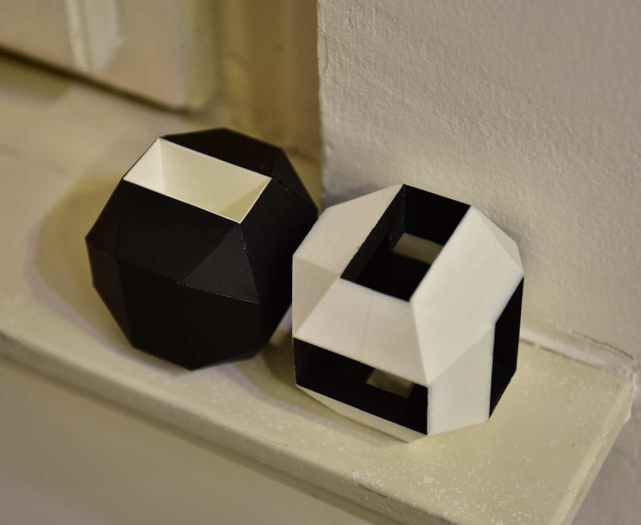 Ve své největší a nejtenčí práci, začleněné na výstavu, vyšel Prokeš přímo z možností galerie. Jednak ze stěn, viditelných již od vstupu, jednak z proporcí dveřních otvorů, které provázal světelnou instalací, iluzivní enfiládu čtyř průchodů rozšířil o zářící náznak dalších dvou. Zdrojem se staly silné divadelní reflektory. Hrany, navazující obdélným tvarem na průchody a zvýrazňují jev zvaný světelná aberace, vyvolávající na zdi lem mezi ostrým zářením a ztemnělým okolím. Zdá se pak, že jas přímo sálá ze stěny. Prokeš je dlouhodobě zaujat předpokladem, že vesmír je dvanáctistěn, jehož protilehlé strany jsou totožné. Po galerii mimo to také volně rozmístil několik papírových krystalů o 48 hranách a 26 plochách, obsahujících ve zmenšeném měřítku enfiládu dveřních otvorů Topičova salonu. Rozměr šestice ploch určoval poměr jejich výsky a šířky. Prokeš vymanil krystal z alegorických souvislostí, kdy na ojedinělých plastikách z italského manýrismu pod jeho tíží klesal Kronos, nesoucí jej na zádech. Ve svém dlouhodobém zájmu o platonská tělesa, spojuje Prokeš bezčasí věčnem. Prokeše poutá prázdno, existující ještě před vznikem prostoru, tematizované jeho nejstarším, dosud nevystaveným dílem, vektorovou grafikou Prázdný triptych (2014), jejíž základní lineární směry ustalují prostor.“