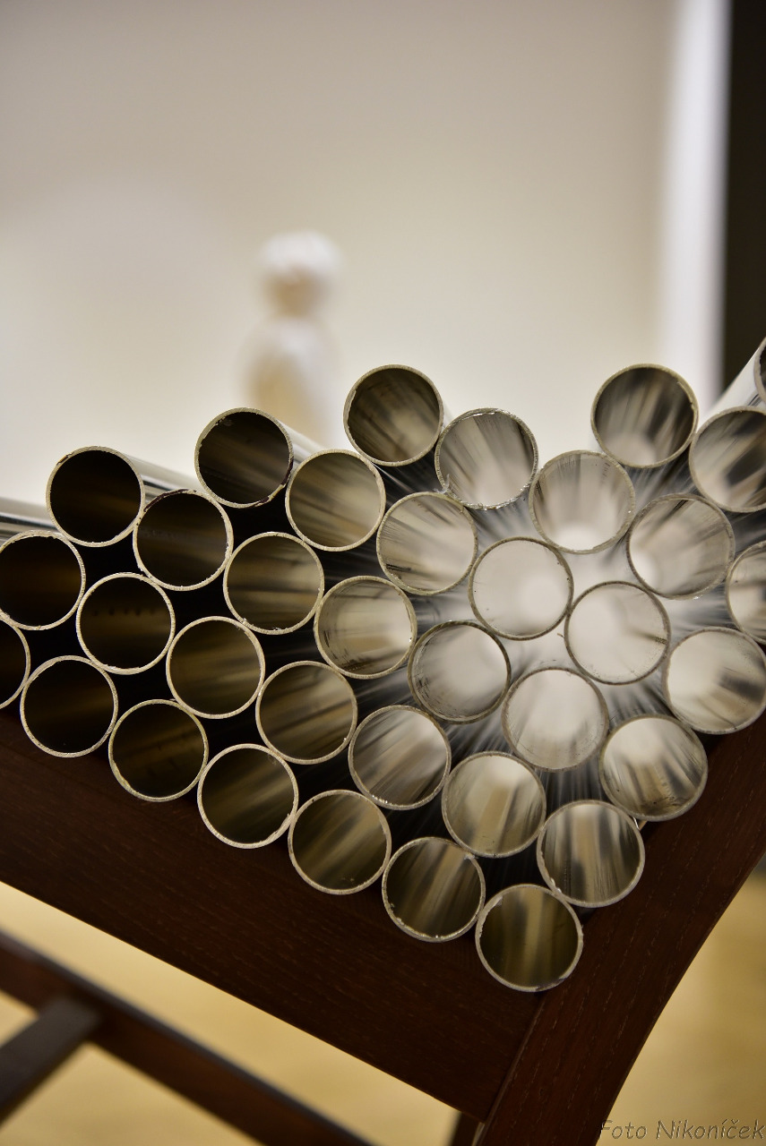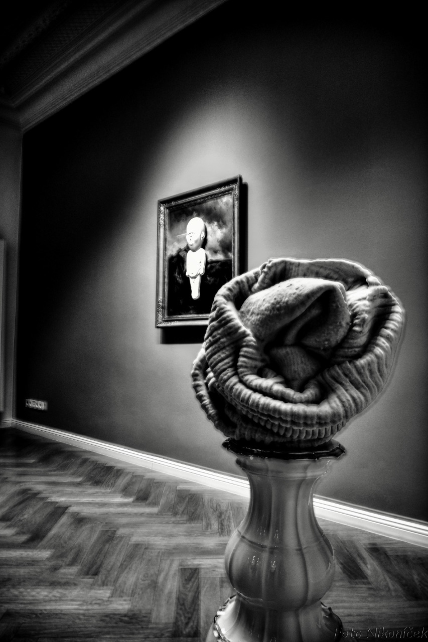 Na principu absurdního kontrastu funguje i srolovaná ponožka mého otce – bezcenný každodenní artefakt spojený s osobními vzpomínkami, který se díky digitálnímu skenování, tisku v monumentální verzi a následnému umístění na honosný historický podstavec stává nejcennější památkou.
