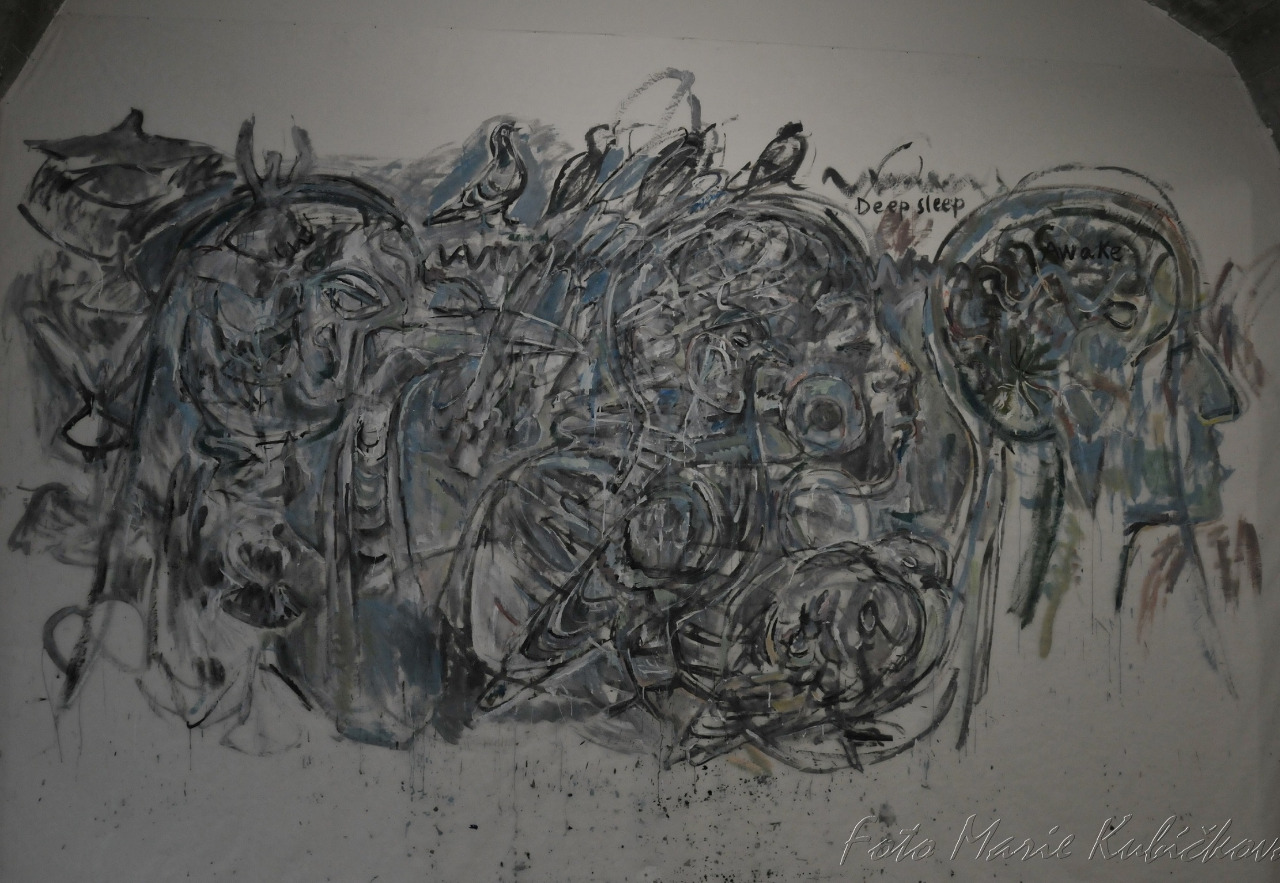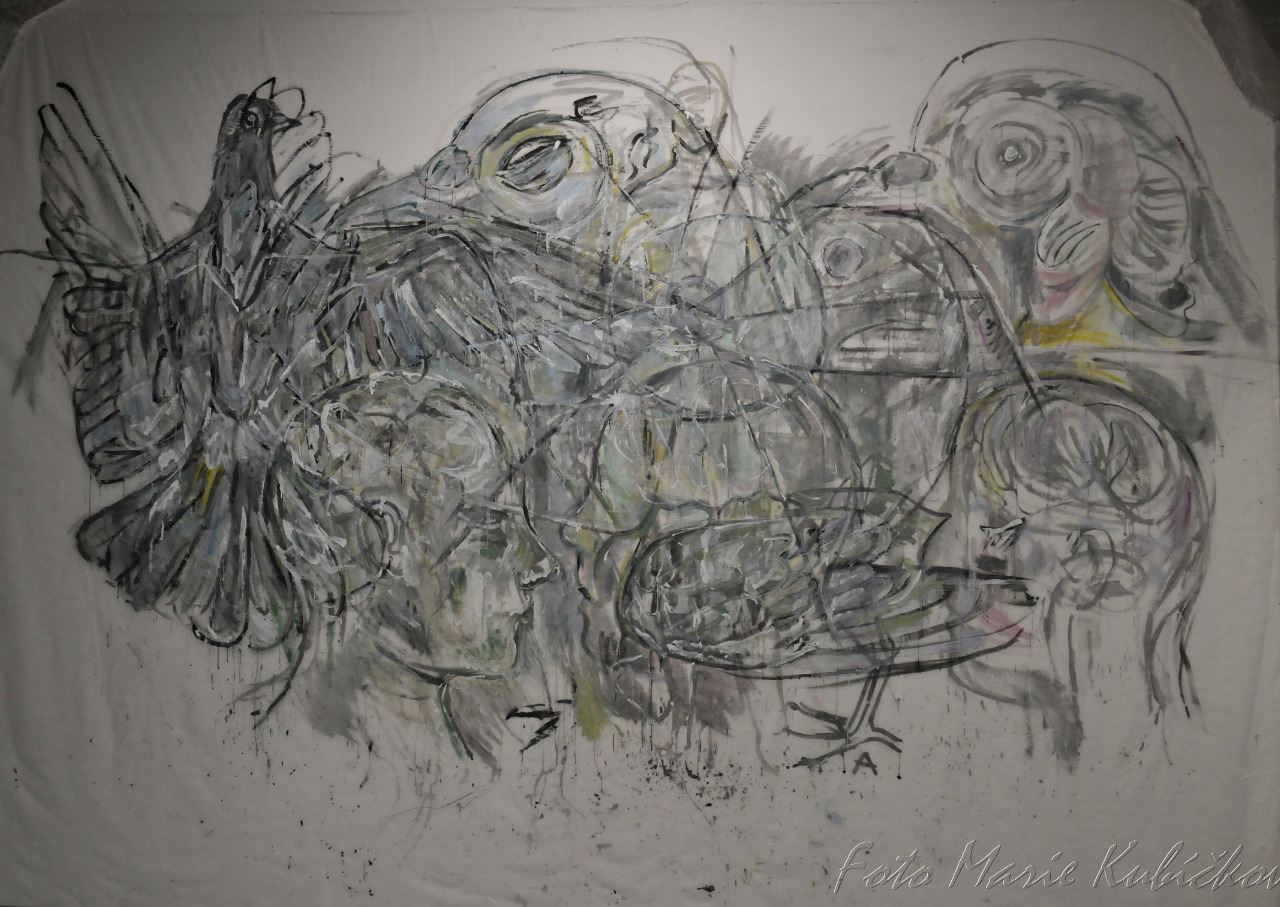 Oksana si také kladla třeba otázku, za a jak by bylo možné malovat na neviditelný podklad. Výsledkem jsou monumentální pseudo-murály, připravené přímo pro výstavu Pragovka Gallery. Jsou na netkané průsvitné textilii...