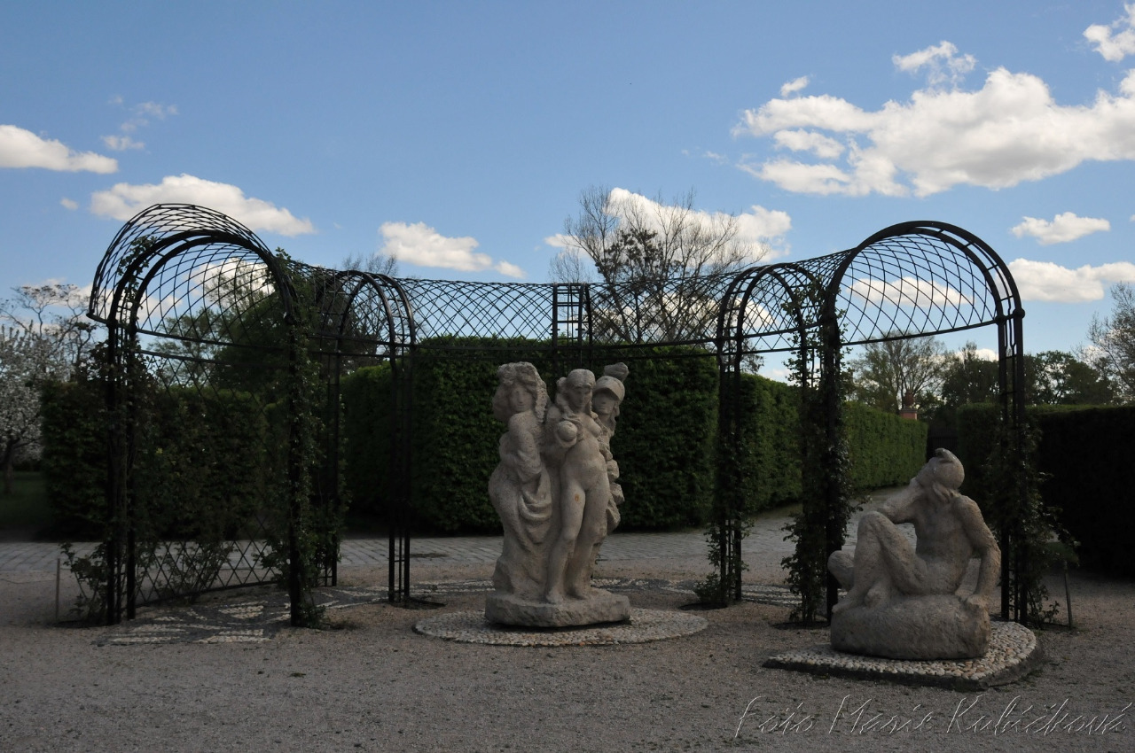 V zahradě se ale samozřejmě nacházejí i zdobné objekty se štukovou výzdobou a motivy z antické mytologie. Působí jako byste procházeli zahradou v samotné Versailles. Skoro.