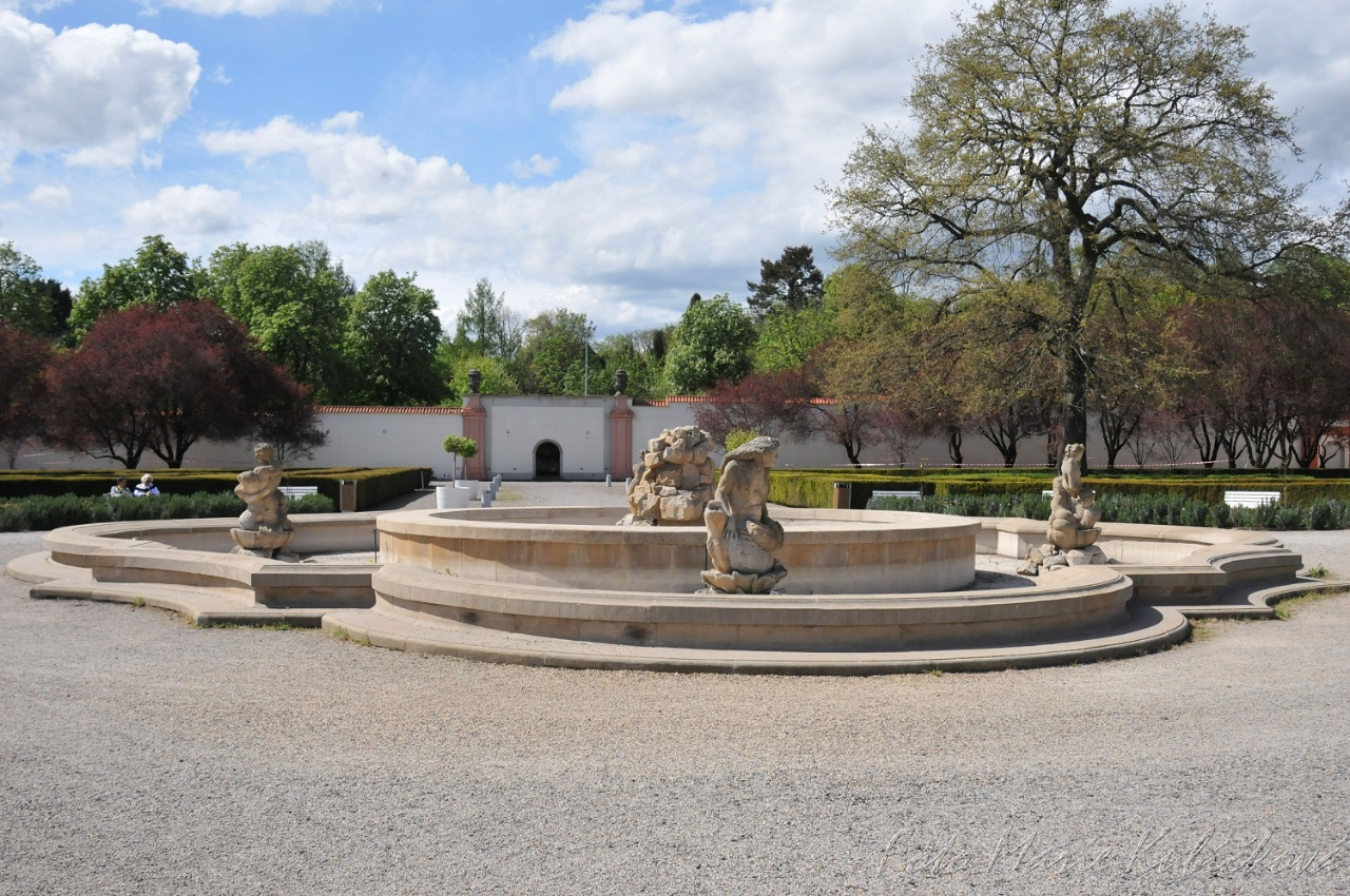 Hned v samé středu hlavní zámecké zahrady, v trase vedoucí od jižního druhdy hlavního vchodu k terasovitým schodům, potkáme již od 18. století monstrózní obří kašnu se sochami. Tedy zubem času, povodněmi a možná lidským přičiněním, ne zcela kompletní, ale zřetelně odborníky kvalifikovaná jako typickou barokní fontánu, jaké známe z mnoha náměstí v Římě. Rekonstrukce prováděné v roce 1978 ale mnohé o původní podobě napověděly.